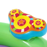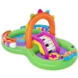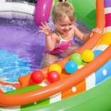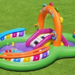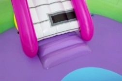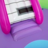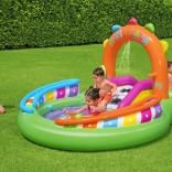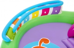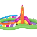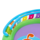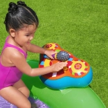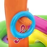Ontdek en geniet van vele leuke functies met het opblaasbare water-speelcentrum Sing and Splash. Het speelcentrum bevat een microfoon en een trommel waarmee kinderen kunnen spelen en zo hun fantasie prikkelen. De dubbele badjes zijn met elkaar verbonden door een afneembare glijbaan die met touwen en lussen is bevestigd. In de bodem zit een ingebouwd opblaasbaar kussen voor een zachte landing vanaf de glijbaan. De boog met ingebouwde sproeier hoeft alleen op de tuinslang te worden aangesloten. Op de punten van de boog kun je opblaasbare ringen gooien. De set bevat 6 gekleurde ballen die je zowel over de ene als de andere baan naar beneden kunt laten rollen. Deze spelletjes zijn niet alleen leuk, maar stimuleren ook de oog-handcoördinatie.