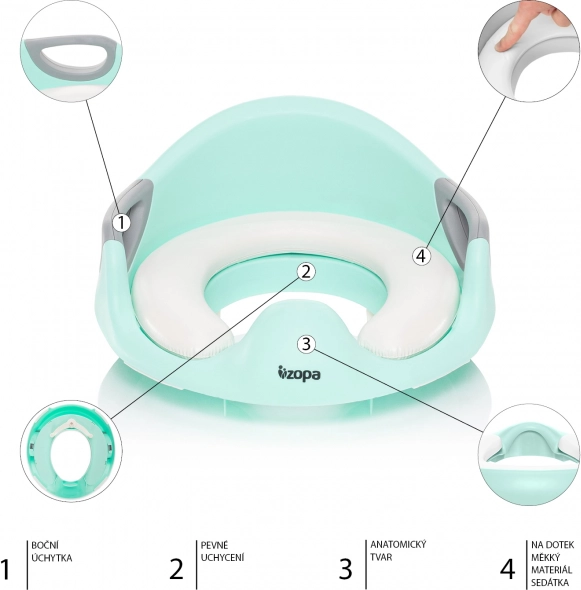 De overgang van het potje naar het gewone toilet is voor elk kind een grote verandering. Met de praktische helper – de WC-bril ZOPA Coach – lukt dat echter moeiteloos. De bril is gemaakt van duurzame, niet-giftige BPA-vrije kunststof die op veiligheid is getest. Voor maximaal comfort is aan de stevige constructie een zachte, waterbestendige inzet bevestigd die bestand is tegen scheuren en vervorming. Slim geplaatste handgrepen bieden steun tijdens het zitten.