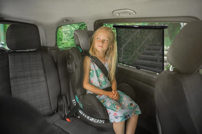 Het minimalistische ontwerp in het zwart past perfect bij elk interieur, terwijl het fijne gaas effectief de doorgang van zonnestralen beperkt en het comfort van de inzittenden verhoogt. Het scherm is verstelbaar, opvouwbaar en dankzij het oprolmechanisme trek je het met één druk op de knop eenvoudig uit of rol je het weg.