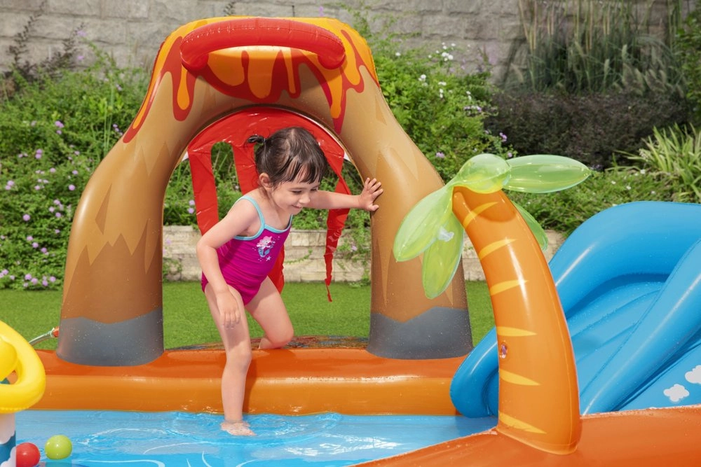 Verander je tuin in een klein aquapark-koninkrijk! Dit opblaasbare speelcentrum met vulkaanthema biedt een leuke glijbaan, een waterfontein en kleurrijke ballen voor eindeloos speelplezier. Zacht maar duurzaam PVC zorgt voor de veiligheid van kinderen, terwijl het ruime ondiepe badje ideaal is voor de allerkleinsten vanaf 2 jaar.
