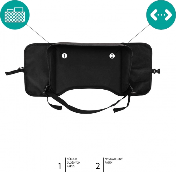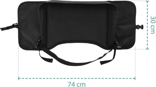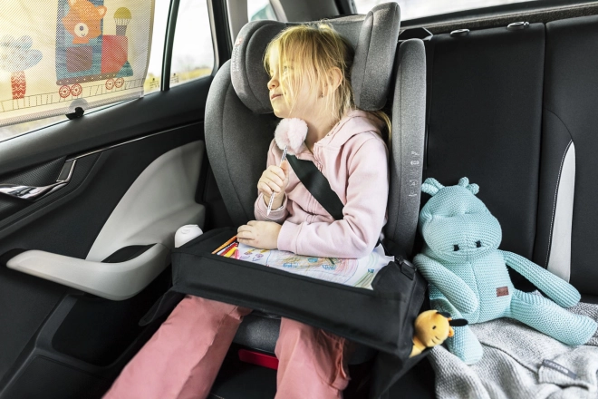Praktisch speelblad voor de kinderautostoel voor kinderen van 3 tot 10 jaar maakt elke autorit leuker. Biedt een stabiel oppervlak om te spelen, tekenen of een snack te nemen en heeft aan de zijkanten ruime vakken voor speelgoed en kleinigheden. Dankzij de verstelbare riem is het eenvoudig en veilig te bevestigen, het duurzame materiaal is snel te reinigen en het minimalistische zwarte design past bij de meeste autostoelen.
