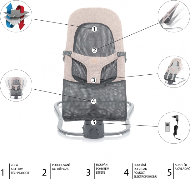 Wipstoeltje ZOPA Moyo Air mesh beige: ademend mesh, 3 standen, elektrisch en natuurlijk schommelen, 5 snelheden, timer, geluiden, vanaf de geboorte tot 9 kg.