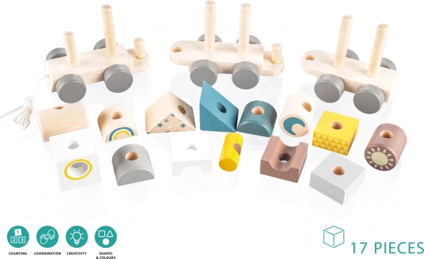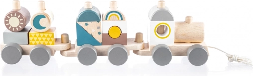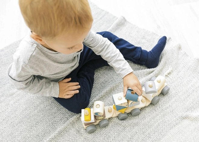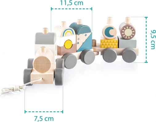 Het speelgoed bestaat uit 14 kleurrijke onderdelen die eenvoudig kunnen worden gecombineerd en opgebouwd tot verschillende vormen en configuraties. Na het voltooien van het bouwen kan de trein met een handige trekkoord worden voortgetrokken, wat een extra speelniveau toevoegt.