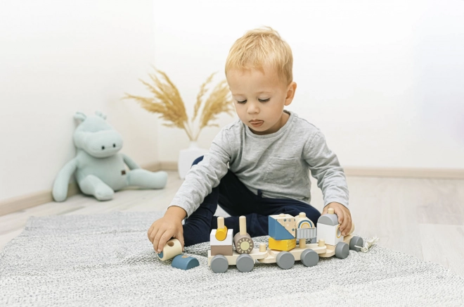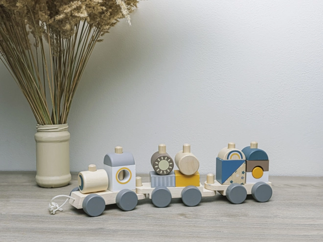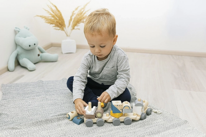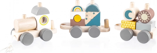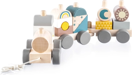 Kleurvolle houten trein voor kinderen die hun motorische vaardigheden ondersteunt. Deze interactieve en educatieve trein kan worden opgebouwd en voortgetrokken, wat kinderen motiveert om te lopen en hun creativiteit ontwikkelt.