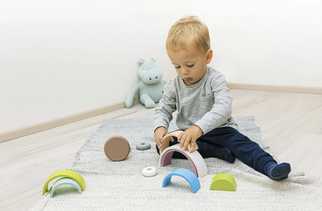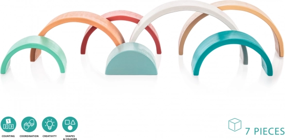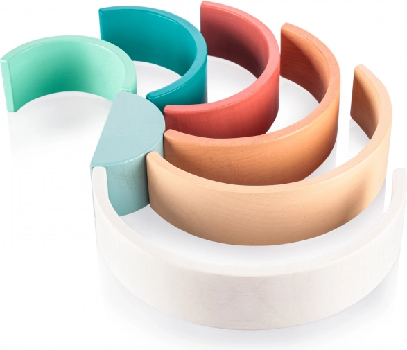 Dankzij de zeven kleurrijke bogen, gemaakt van hoogwaardig beukenhout, kunnen kinderen tunnels bouwen, huisjes voor dieren maken of bruggen voor auto’s. De mogelijkheden zijn eindeloos en de kinderfantasie kan volop bloeien.