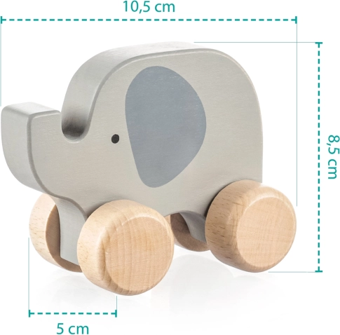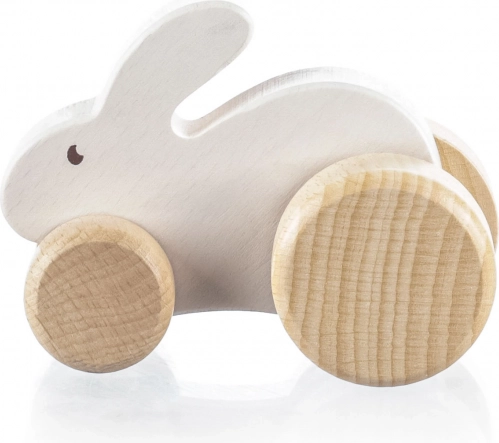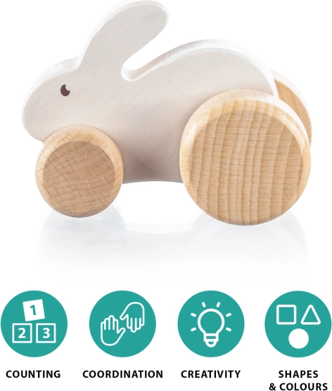 Het houten rijdende konijntje is ontworpen om perfect in kleine kinderhandjes te passen. Het is gemaakt van hoogwaardig, natuurlijk hout en geverfd met watergedragen verf die veilig is voor kinderen. Dankzij de duurzame wielen rijdt het gemakkelijk over tapijt, houten vloeren en zelfs op de speelplaats.