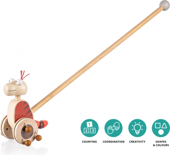 De houten duw-dinosaurus is ideaal voor kinderen vanaf 16 maanden die de wereld om zich heen beginnen te ontdekken. Dankzij het aantrekkelijke dinosaurusontwerp en de lange stok met een houten bal aan het uiteinde kunnen kinderen veilig leren lopen. Wanneer de dinosaurus beweegt, maken de houten kralen aan de wieltjes geluid, wat het kind boeit en aanmoedigt tot verdere stapjes.