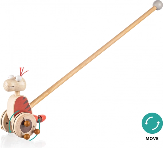 Het speelgoed is niet alleen leuk, maar ook praktisch. De stevige houten stok van 48 cm dient als steun bij de eerste stapjes en het speelgoed heeft geen scherpe randen, wat de veiligheid tijdens het spelen waarborgt. Het is gemaakt van hoogwaardig en duurzaam hout, wat een lange levensduur van het speelgoed garandeert. Het is een geweldige metgezel voor spelen thuis en voor wandelingen buiten.