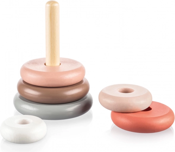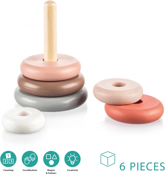 Stapelen, uit elkaar halen, sorteren en tientallen verschillende combinaties – dat zijn de houten stapelringen voor nieuwsgierige ontdekkers. De set bestaat uit 6 stukken van verschillende grootte die naar wens op elkaar gestapeld kunnen worden.
