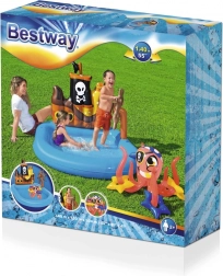 Tover je tuin om tot een klein waterparadijs. Deze opblaasbare piraten-speelplaats van BESTWAY biedt een blauw badje met scheepsdecor, een draaibaar roer, werpringen/sterretjes en een vrolijke octopus. Gemaakt van duurzaam PVC, eenvoudig op te zetten en ideaal voor veilige waterpret voor de allerkleinsten.