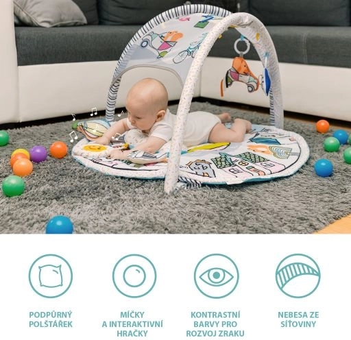 Er is een gevormd ondersteunend kussentje inbegrepen dat steun biedt tijdens tummy time en bij de eerste pogingen tot kruipen. Contrasterende kleuren en patronen stimuleren het visuele waarnemen en bevorderen de focus. In de verpakking vind je ook 20 gekleurde balletjes voor extra spelletjes en sensorische stimulatie.