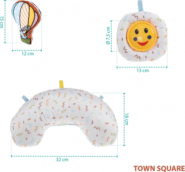 - Gevormd ondersteunend kussentje, 20 gekleurde balletjes, hangspeeltjes (waaronder een met melodie)