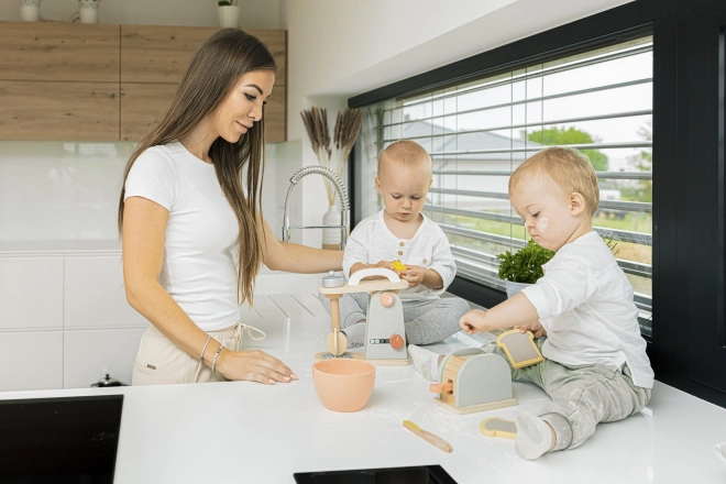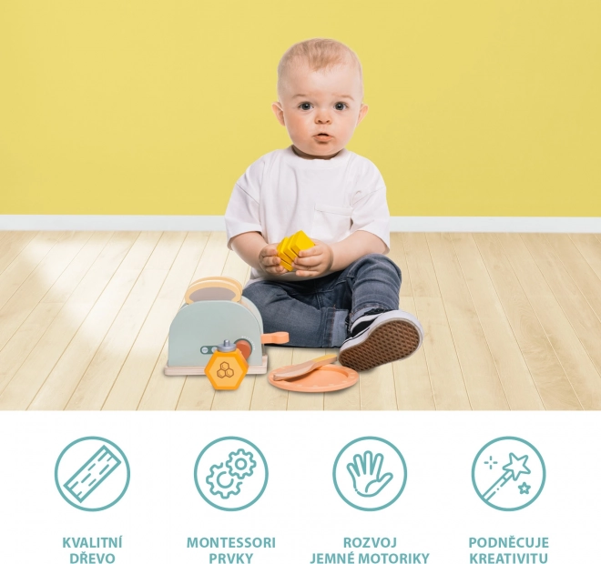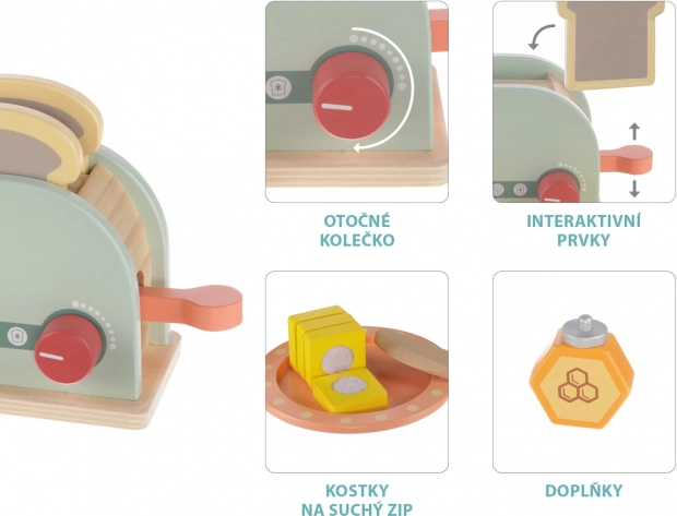 Maaltijden bereiden is leuk – ook met houten speelgoed. De set bevat een toaster met een snee toast. Na het indrukken van de hendel springt de toast uit de toaster. Inclusief een bordje met mesje en boter, zodat het ontbijt compleet is. Het speelgoed ontwikkelt coördinatie, ruimtelijk inzicht en handvaardigheid. De toaster is gemaakt van kwalitatief hout en verf op waterbasis.