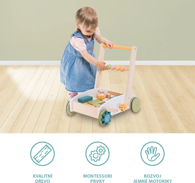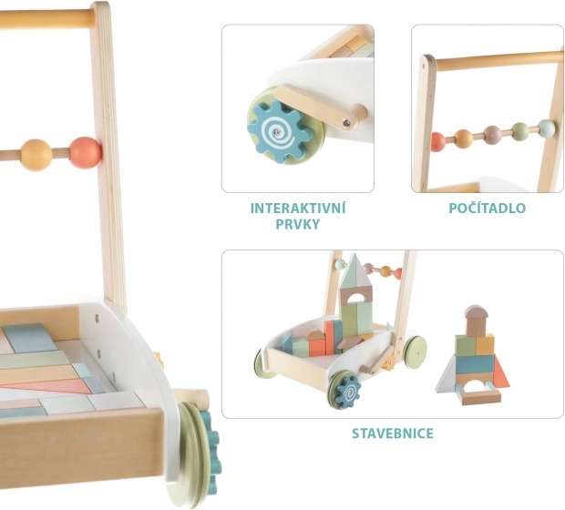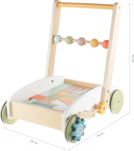 De verbeelding kent geen grenzen. Het compacte wagentje met houten handgreep is gevuld met kleurrijke blokken waarmee een kind van alles kan bouwen. Haal je de blokken uit het wagentje, dan kun je het gebruiken om andere speeltjes te vervoeren. De handgreep is voorzien van houten kralen die van de ene naar de andere kant kunnen worden geschoven. De stevige wieltjes zijn geschikt voor elk type vloer. Het speelgoed stimuleert coördinatie, motoriek, ruimtelijk inzicht en fantasie.