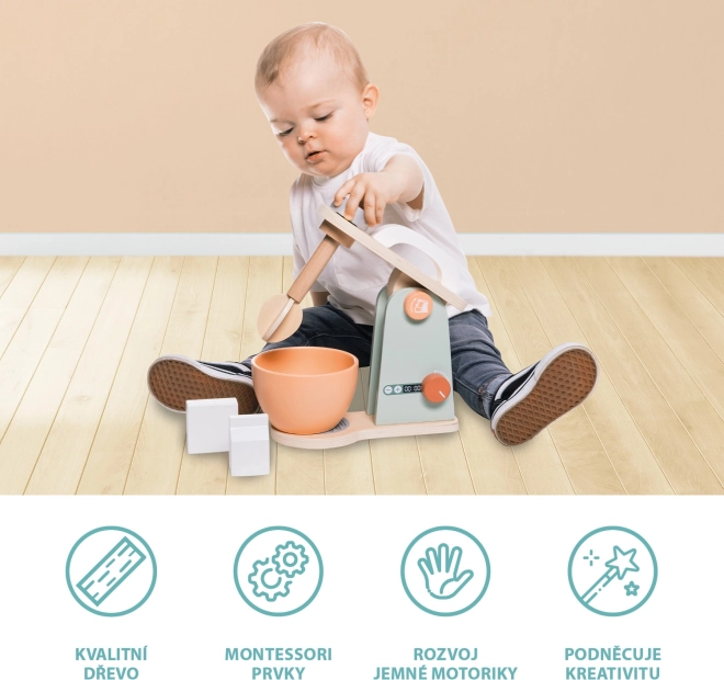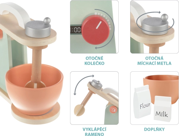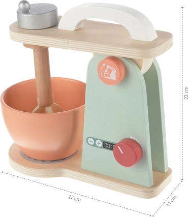 Een doordachte mixer voor alle kinderen die de lekkerste baksels willen maken. De mixer heeft meerdere knoppen die kunnen worden gedraaid of ingedrukt. Inclusief een kom waarin de keukenmachine het deeg mengt. Het speelgoed is gemaakt van kwalitatief hout en verf op waterbasis.