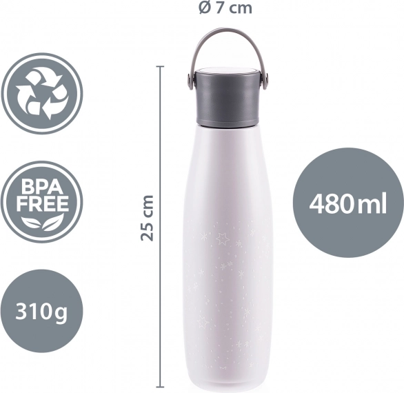Deze kwalitatieve thermosfles voor vloeistoffen met een inhoud van 480 ml houdt warme dranken tot 12 uur warm en koude dranken tot 24 uur koel. Ze is gemaakt van hoogwaardig roestvrij staal dat bestand is tegen corrosie. De goed afsluitende dop zorgt ervoor dat de thermosfles niet lekt. Dankzij de vacuümisolatie wordt de buitenkant niet warm wanneer de fles met hete vloeistof is gevuld. Voor comfortabel vasthouden is de thermosfles voorzien van een handgreep.