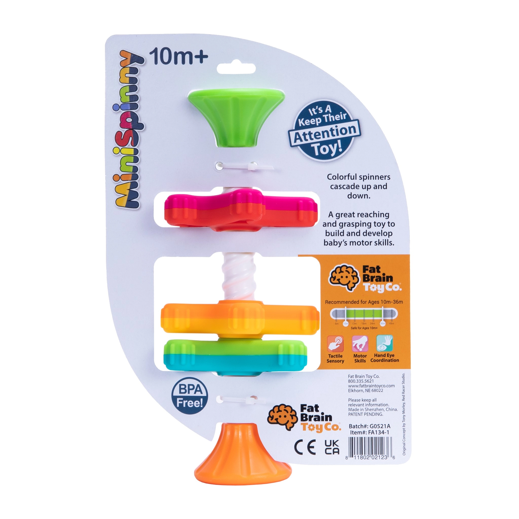 MiniSpinny is een slimme sensorische speelgoedervaring die kinderen boeit met beweging, kleur en aanraking. Drie schijfjes met verschillend aantal “pootjes” draaien soepel langs een spiraalstaaf en creëren tijdens het naar beneden glijden een fascinerend visueel effect. Getextureerde oppervlakken nodigen uit tot verkennen en stimuleren spelenderwijs tastzin en coördinatie.