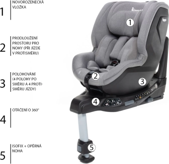 Anatomisch gevormde zijpanelen beschermen de zijkant van het kind over de volledige hoogte en zorgen samen met de dubbelwandige kuip voor de hoogst mogelijke bescherming bij een eventuele botsing. De autostoel bevat ook een comfortabele inleg voor pasgeborenen en een verstelbare hoofdsteun van zacht schuim. De 5-punts veiligheidsgordels hebben een speciale antislipafwerking op de schouderpads die voorkomt dat ze afzakken. Tevens kan de hoogte worden aangepast naarmate het kind groeit.