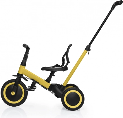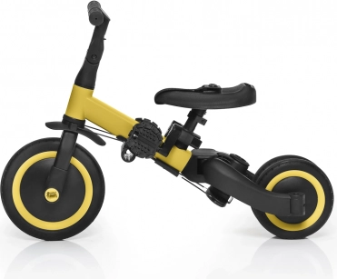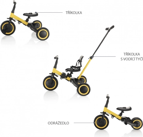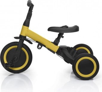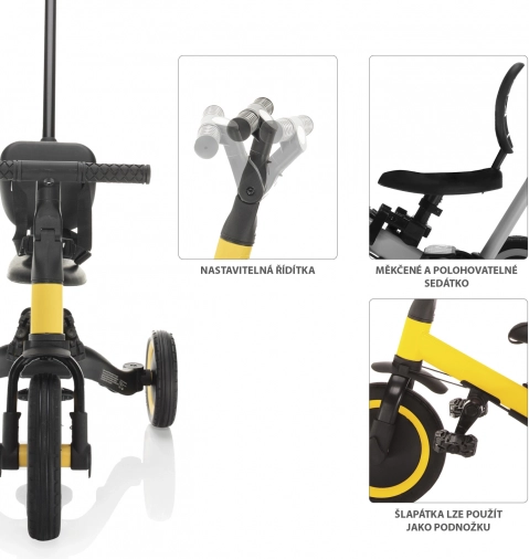 Eén voertuig dekt drie ontwikkelingsfasen: 18–36 maanden driewieler (met/zonder duwstang), 36–48 maanden loopfiets en 48–60 maanden fiets.