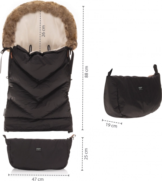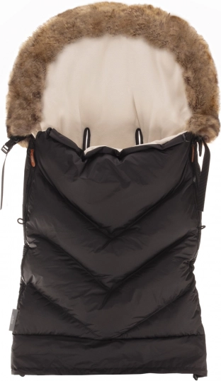 Warme voetenzak in een stijlvolle uitvoering, geschikt voor zowel een kinderwagenbak als een sportieve buggy. De voetenzak beschermt het kind tegen koud weer, regen en harde wind dankzij de wind- en waterbestendige buitenstof en de extra warme voering, die is afgewerkt met een bontkraag.