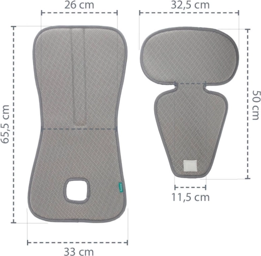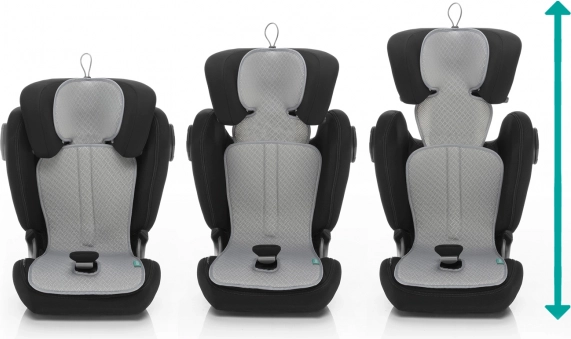 Twee afzonderlijke delen zorgen voor volledige bedekking van zit-, rug- en hoofdgedeelte in verschillende standen van de hoofdsteun. De instelling is eenvoudig met klittenband.