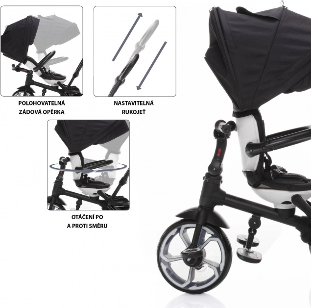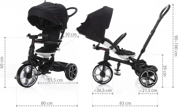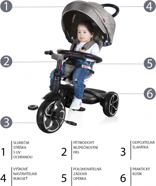 Moderne driewieler voor kinderen van 6 tot 36 maanden met een elegant sportief design. Uitgerust met een verstelbaar draaibaar zitje, 5-punts veiligheidsgordel en een dakje met UV-bescherming voor maximaal comfort en veiligheid tijdens de rit.