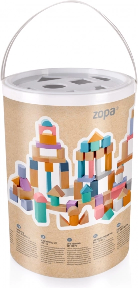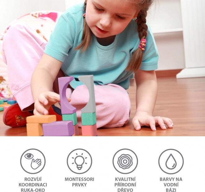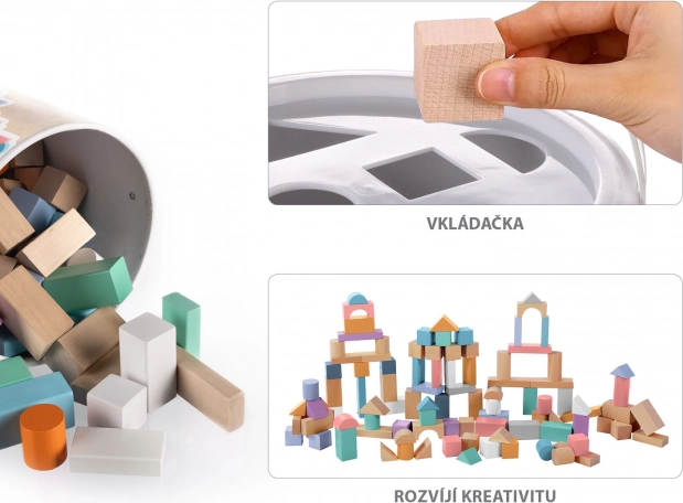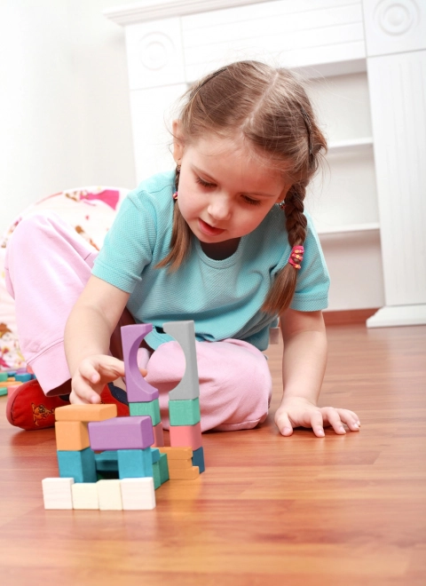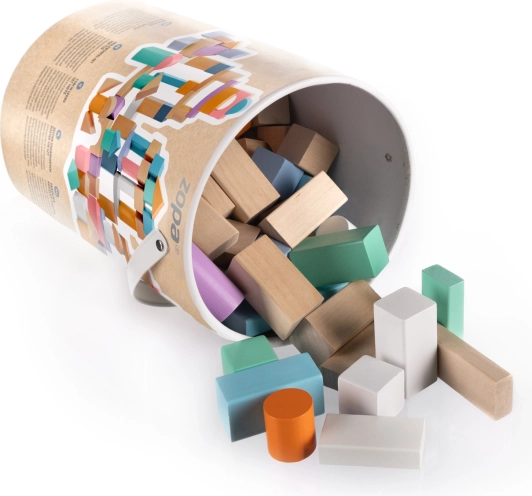 De blokken komen in verschillende vormen, waaronder kubussen, cilinders en driehoeken, in pastelkleuren ter bevordering van creativiteit.