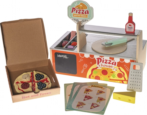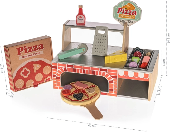 Houten Pizzeria Set laat kinderen hun eigen pizzeria creëren met een authentieke bediening. De houten balie bevat alle benodigde elementen voor het bereiden van een heerlijke pizza.
