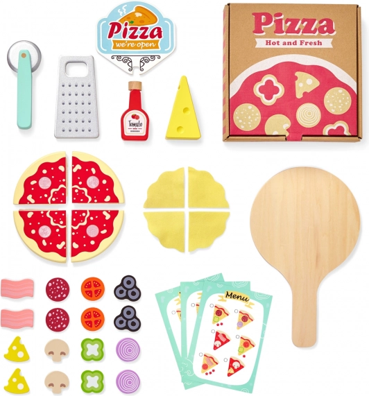 - Onderdelen: pizzamenu, geld, pizzadoos en houten mes.