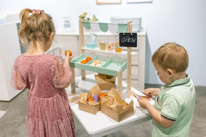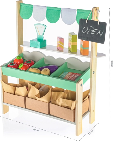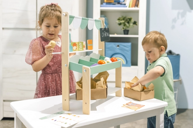 Stijlvolle houten kraam voor kinderen stelt kleine handelaars in staat hun eigen markt thuis te creëren. De kinderfantasie bloeit dankzij het brede aanbod aan houten fruit en accessoires.