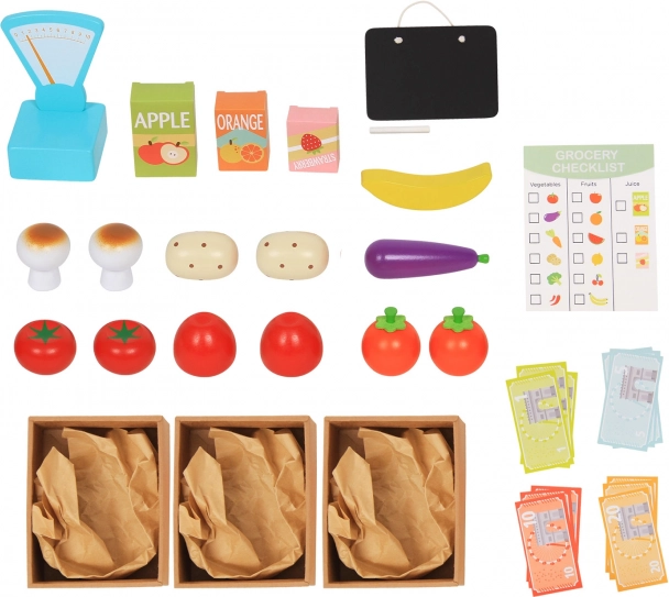 De set bevat alles wat je nodig hebt om op de markt te verkopen – houten fruit en groenten, een weegschaal en een boodschappenlijst.