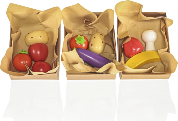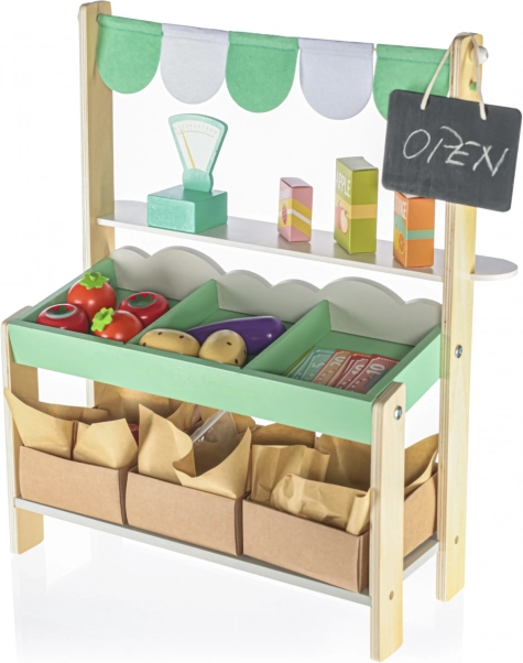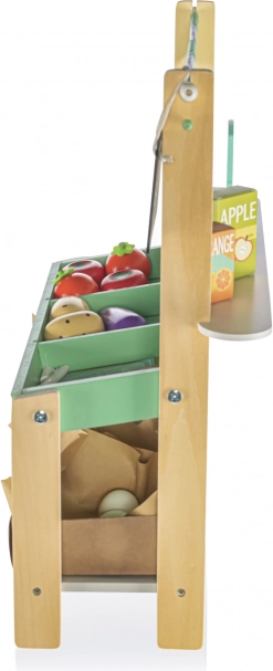 Complete winkeluitrusting – alle benodigde accessoires zijn inbegrepen. Je vindt er houten kratjes, een weegschaal, een boodschappenlijst en geld. Kinderen kunnen in de rol van verkopers en klanten stappen en leren hoe een markt werkt.
