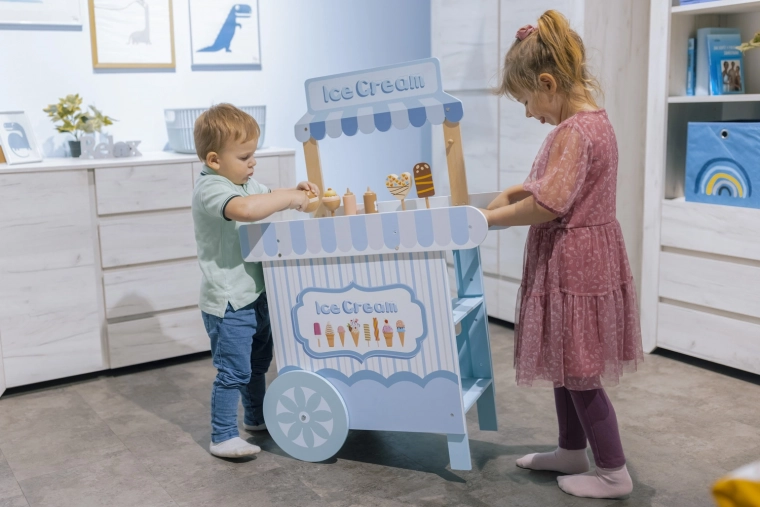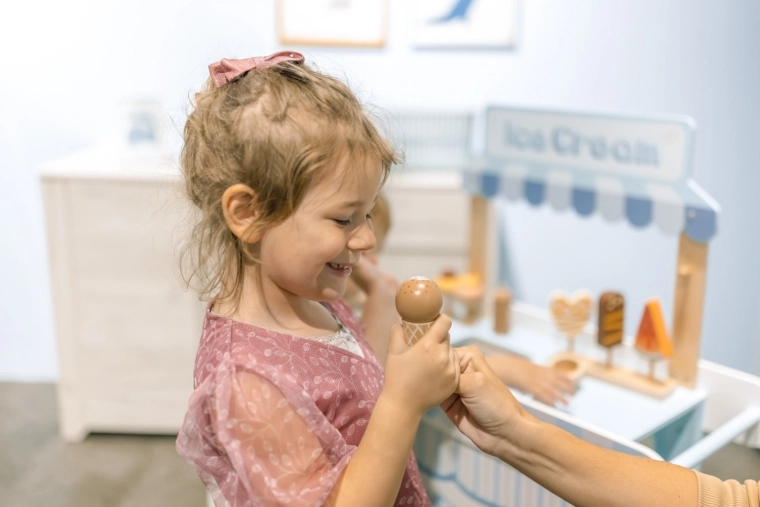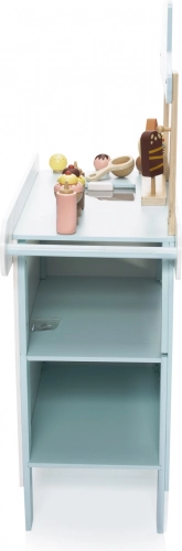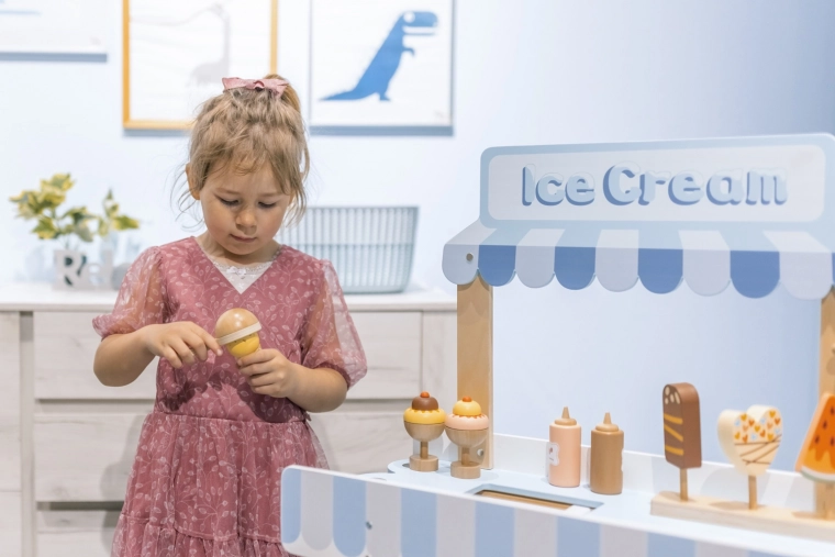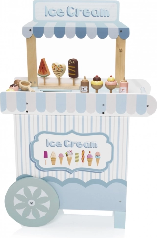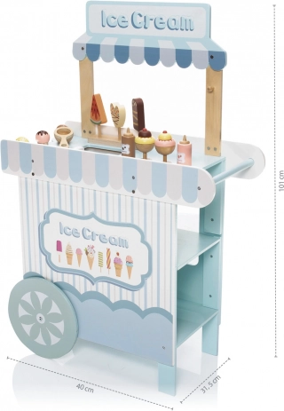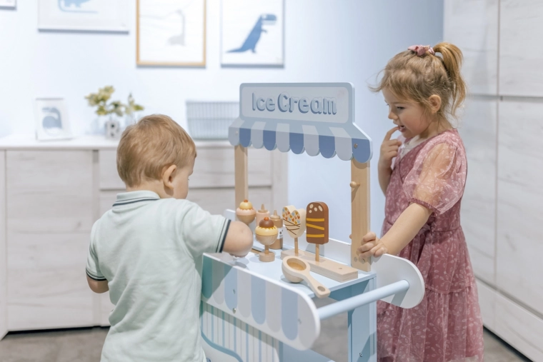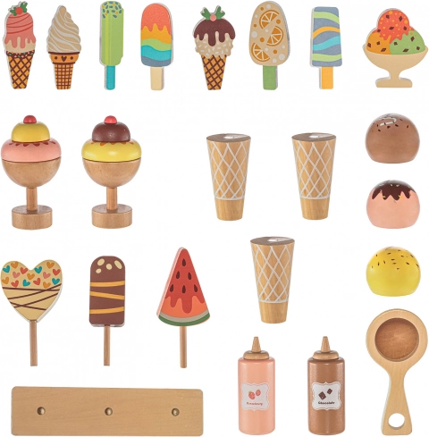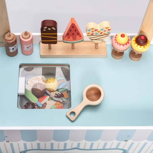 De houten verrijdbare ijskraam is een ideale tool voor de ontwikkeling van de kinderlijke verbeelding en sociale vaardigheden. Deze zorgvuldig ontworpen set is uitgerust met alle benodigde accessoires, waaronder realistische ijslekkernijen en een vriesvak om het ijs altijd vers te houden. Kinderen kunnen ijsverkoper spelen en heerlijke ijscreaties maken.