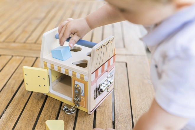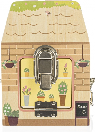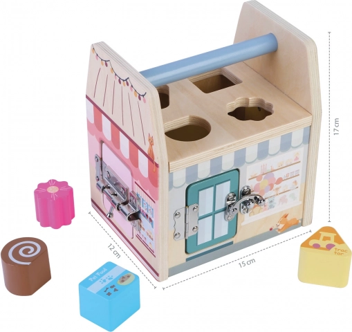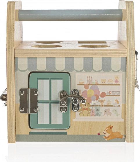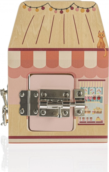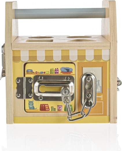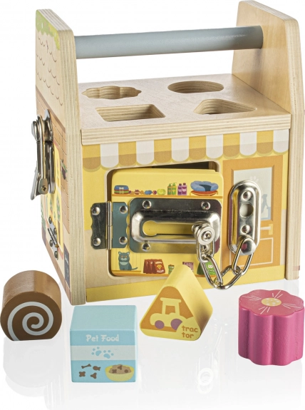 Elke zijde van deze houten kubus stelt een andere winkel voor en elke winkel heeft, zoals het hoort, zijn eigen speciale slot tegen inbrekers. Door met de slotjes te spelen leren kinderen logisch en ruimtelijk denken.