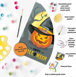 De CreArt Happy Halloween-set brengt kinderen plezier in het creëren en de zekerheid van een prachtig resultaat. Dankzij de genummerde vlakken en de meegeleverde verven vinden kinderen gemakkelijk hun weg en kleuren ze stap voor stap een griezelig vrolijk Halloweenmotief in. Schilderen op nummer stimuleert geduld, concentratie en fijne motoriek en is bovendien heerlijk ontspannend.