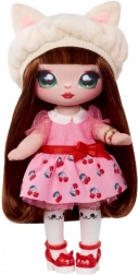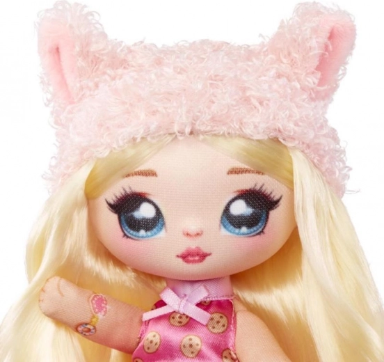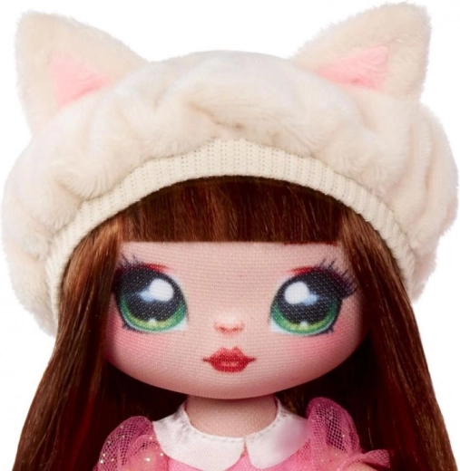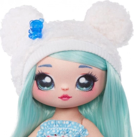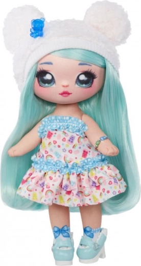 Een pop met grote expressieve ogen en turkooizen haar, met een pluizig hoedje met berenoren, nodigt kinderen uit om te spelen en te knuffelen dankzij haar kleurrijke uiterlijk.