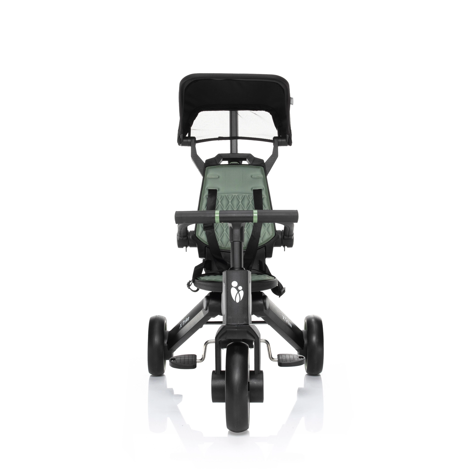 De driewieler is opvouwbaar en compact, zodat hij in de kofferbak van de auto of in een kleine hal past. De praktische afneembare tas en draaghoes maken reizen gemakkelijker. Veiligheid wordt gewaarborgd door de 5-puntsgordel, de verstelbare beugel en de rem op de achterwielen.