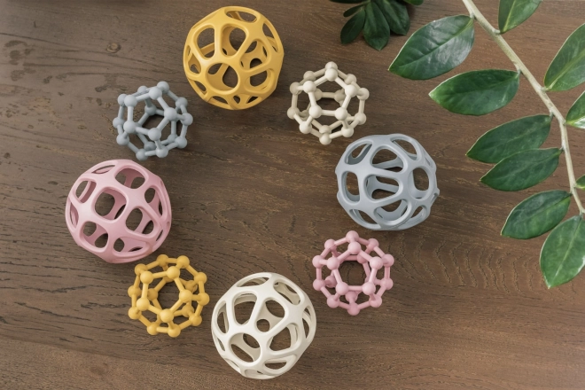 De bijtring is gemaakt van veilige siliconen van voedingskwaliteit, die niet giftig en breukbestendig zijn. Voor kleine kinderen voelt siliconen natuurlijker aan dan plastic of metaal. Het ontwerp in de vorm van een open balletje past uitstekend zelfs in de allerkleinste vuistjes en het kind kan hem vanuit elke hoek gemakkelijk vastpakken. Dankzij de vorm stimuleert de bijtring de handmotoriek, vooral de oog-handcoördinatie.