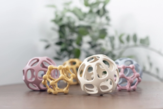 De bijtring is gemaakt van veilig food-grade siliconen, dat niet giftig en breukbestendig is. Voor kleine kinderen voelt siliconen natuurlijker aan dan plastic of metaal. Het open balvormige design past zelfs in het allerkleinste vuistje en het kind kan het vanuit elke hoek gemakkelijk vastpakken. Door de vorm stimuleert de bijtring de handmotoriek, vooral de hand-oogcoördinatie.