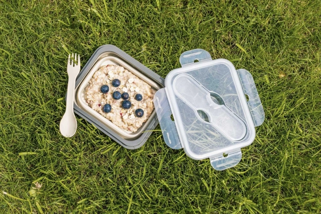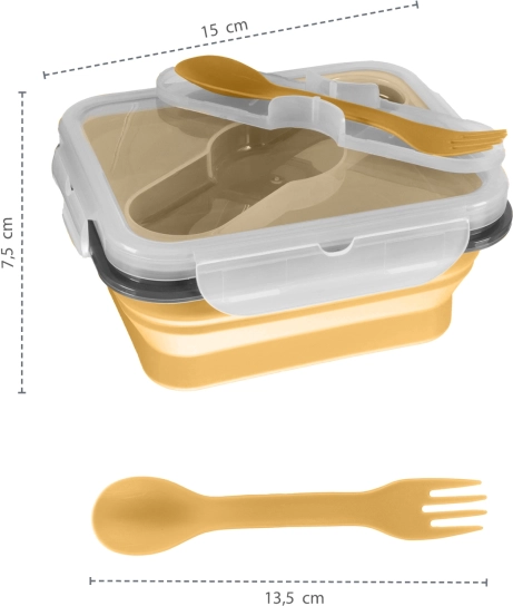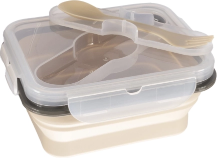 Deze snackbox is gemaakt van veilig voedselwaardig siliconen dat niet giftig is en bestand is tegen breuk. Het grote voordeel is dat hij eenvoudig inklapbaar is, waardoor het volume tot 60% vermindert en hij een ideale metgezel is voor uitstapjes. Het deksel sluit zeer goed af en heeft een ingebouwd vakje voor bestek; lepel en vork worden meegeleverd in een praktisch etui.