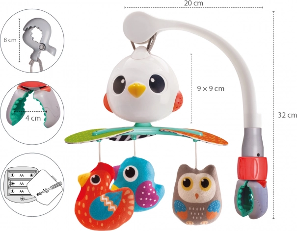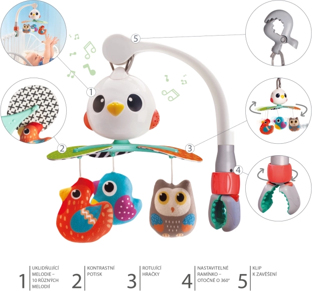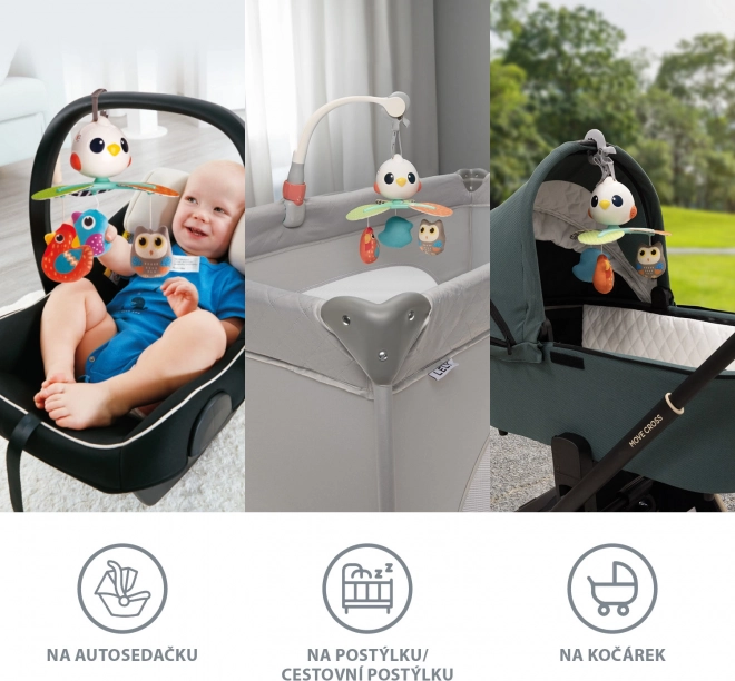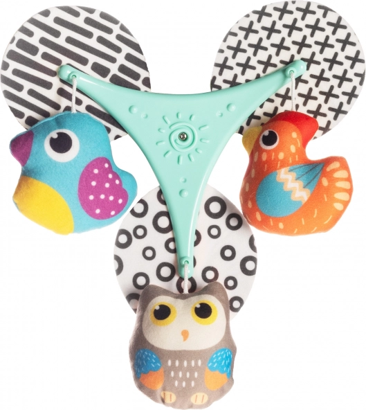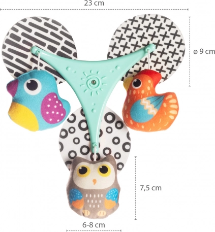 Het draaiende speelgoed biedt niet alleen visuele stimulatie, maar kan ook als op zichzelf staand draaiend speeltje worden gebruikt. Met drie bevestigingsopties voor het autostoeltje, het ledikant of de kinderwagen is je kind altijd omringd door vermaak.