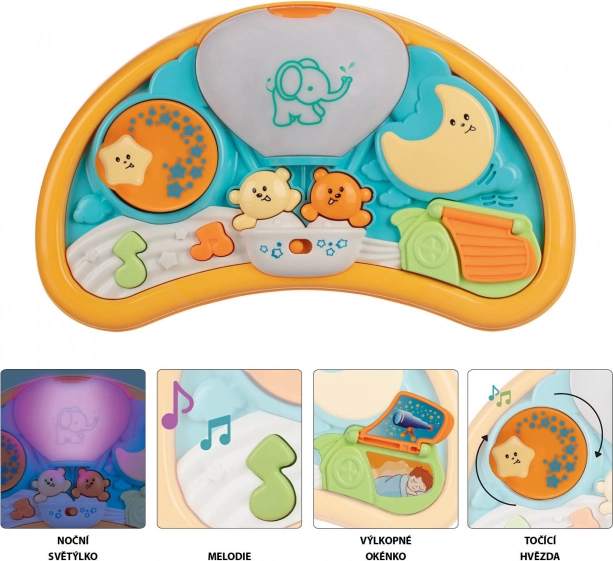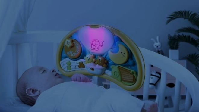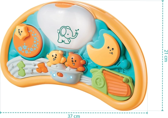 Een schattig interactief speeltje dat een kind urenlang vermaakt. De plaat in de vorm van een maan van hoogwaardig plastic heeft knopjes met beertjes, sterretjes en een maan. Bij het indrukken spelen de knoppen melodieën; de elementen op de plaat kunnen worden gedraaid en op verschillende manieren geopend. Het speelgoed stimuleert de verbeelding en de psychomotorische vaardigheden. ’s Nachts dient het speelgoed als een zacht nachtlichtje dat het kind helpt angst voor het donker te overwinnen.
