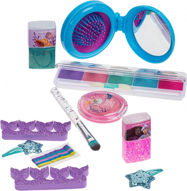 Een betoverende make-upset geïnspireerd door het sprookje De kleine zeemeermin die elke kleine prinses vanaf 3 jaar zal verrukken. Het stijlvolle tasje met ketting bevat 11 veilige onderdelen voor speels make-up aanbrengen en haarstyling: afpelbare nagellakken, een oogschaduwpalette, blush, bodyglitter, haarspeldjes en schuifspeldjes. Alles heeft een niet-giftige samenstelling en is gemakkelijk met water af te wassen.