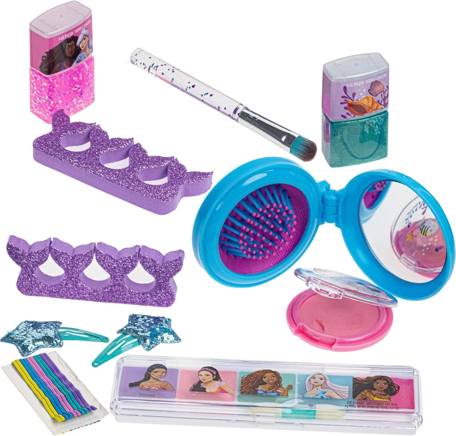 - 2 niet-giftige afpelbare nagellakken, oogschaduwpalette, blush, bodyglitter, 2 haarspeldjes, 10 schuifspeldjes, applicator voor make-up, inklapbare haarborstel met spiegeltje