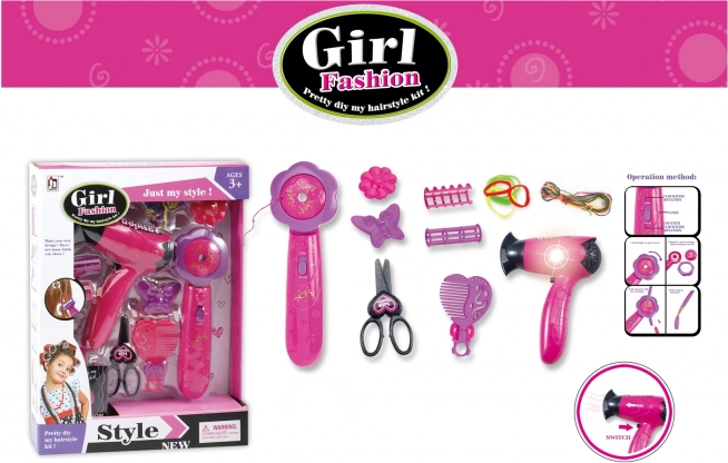 Word een kleine kapster met deze kappersset voor meisjes! De set bevat alles wat je nodig hebt om originele kapsels te maken voor feestjes – van het invlechten van draadjes tot een föhn en krullers.