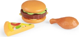 Bevat imitatievoedsel: hamburger, kip en pizza.