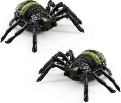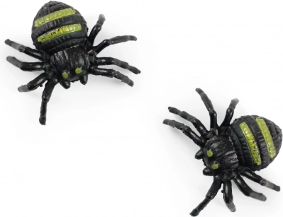 - 2 plastic spinnen met zwarte lijven en groene strepen die spinnen realistisch nabootsen.