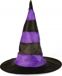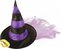 De hoed valt op door zijn iconische toveruitstraling, die een brede rand en gestreept patroon omvat.