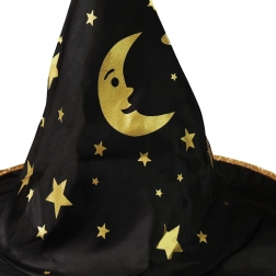 Deze prachtige kinder toverhoed is een onmisbare accessoire voor kleine tovenaars en heksen. Het klassieke ontwerp in zwarte kleur met gouden motieven van sterren en manen brengt een mysterieuze sfeer naar elk Halloweenfeest of thema-evenement.