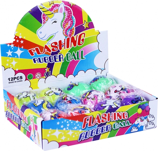 Leuke stuiterbal met eenhoornmotief en geïntegreerd licht dat bij landing in kleur knippert. Geweldig voor kinderen en volwassenen, ideaal om te spelen, te ontspannen en stress te verminderen. Verkrijgbaar in 6 vrolijke kleuren, verpakt per 12 stuks.